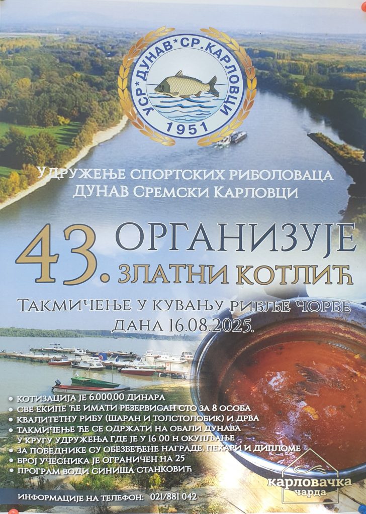 Сремски Карловци ће и ове године бити домаћини једне од најомиљенијих гастрономских манифестација, такмичењу у кувању рибље чорбе – 43. Златни котлић, које ће бити одржано 16. августа на живописној обали Дунава. Организатор догађаја је Удружење спортских риболоваца „Дунав“, које већ више од четири деценије негује ову традицију и спаја љубитеље добре рибље чорбе, природе и дружења.