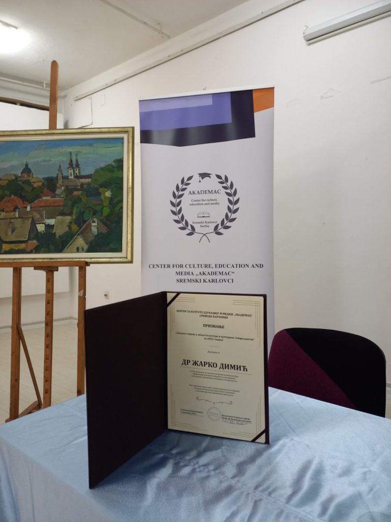 Центар за културу, едукацију и медије „Академац“ из Сремских Карловаца установио је ново годишње признање „Личност године у области културе и културног стваралаштва“. Први лауреат овог престижног признања, за 2025. годину, је др Жарко Димић, један од најеминентнијих савремених културних и научних стваралаца. Ово највише годишње признање у области културе свечано је уручио проф. др Бранислав Санчанин, председник Управног одбора Центра.