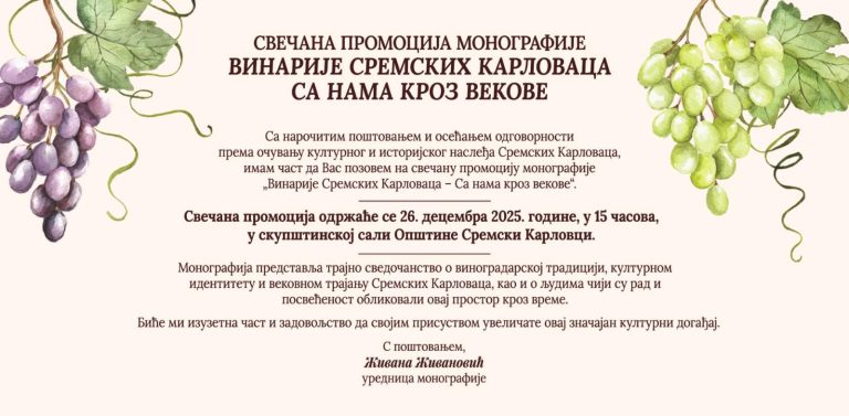 У Сремским Карловцима, месту богате историје и традиције, 26. децембра 2025. године биће одржана свечана промоција монографије „Винарије Сремских Карловаца – Са нама кроз векове“. Догађај почиње у 15 часова у скупштинској сали Општине Сремски Карловци. Монографија представља драгоцено сведочанство…